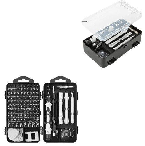 ?Complete Precision Screwdriver Set ?Professional 117-in-1 Multi-Magnetic Screwdriver Set interchangeable precise manual tool set,including magnetic handle,extension shaft,short post,aluminum alloy extension shaft,toolbox,tweezers,iPhone pin,suction cup,bracts,crowbar, 98pcs screw bits, magnetiser/demagnetizer, etc.