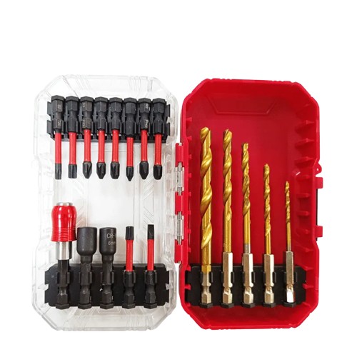 Set Includes: 10pcs 50mm Bits: Phillips: PH1,PH2, PH3; Pozi:PZ1, PZ2, PZ3; Torx:T15, T20, T25, T30; 1PC Quick Release Bit Holder; 2PCS Sockets 48mm: 8mm10mm; 5pcs Drill bits:3mm, 4mm, 5mm, 6mm, 8mm