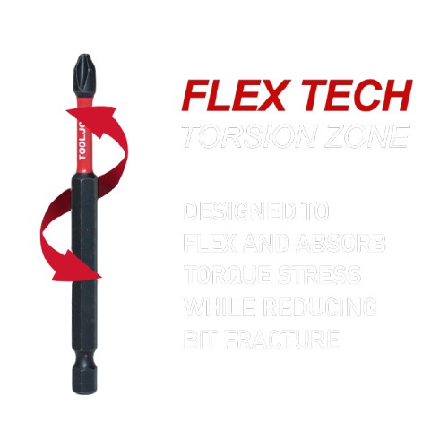IMPACT TORSION tool bits are engineered to meet the rigorous demands of professional and industrial users. The optimized FLEX TECH TORSION ZONE flexes under load to take pressure off of the bit tip and reduce bit fracture resulting in less breakage.