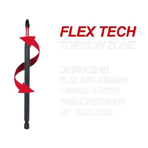 150mm Extra Long IMPACT TORSION tool bits are engineered to meet the rigorous demands of professional and industrial users. The optimized FLEX TECH TORSION ZONE flexes under load to take pressure off of the bit tip and reduce bit fracture resulting in less breakage.