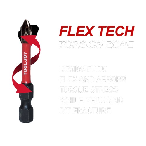 IMPACT TORSION tool bits are engineered to meet the rigorous demands of professional and industrial users. The optimized FLEX TECH TORSION ZONE flexes under load to take pressure off of the bit tip and reduce bit fracture resulting in less breakage.